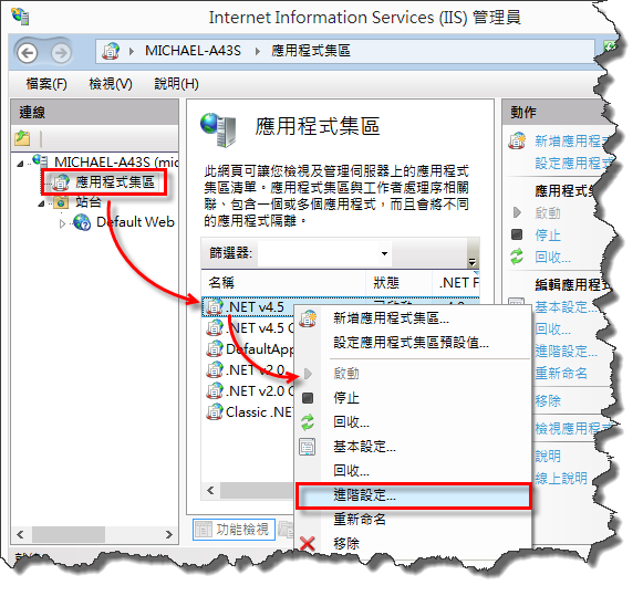 每個應用程式集區有自己的佇列長度參數,預設值是 1000。我們可以透過 IIS 管理員來修改這個參數:在左邊樹狀結構的區域中展開電腦名稱,點選「應用程式集區」,然後在中間內容區塊中找到你想要調整的應用程式集區,於該項目上點右鍵,選「進階設定」,如下圖所示: