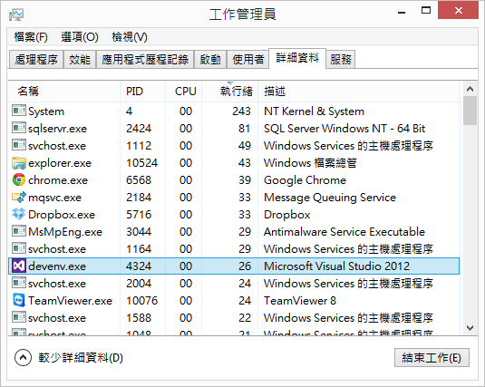 若切換至「詳細資料」頁籤,加入「執行緒」欄位,便能看到每個處理序的執行緒數量,如下圖所示。