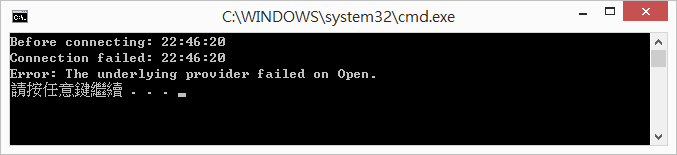 從執行結果可以發現,當資料庫連不上的時候,很快就傳回錯誤了,中間不過一秒的時間(即使在連線字串中指定 Connection Timeout 也一樣)。