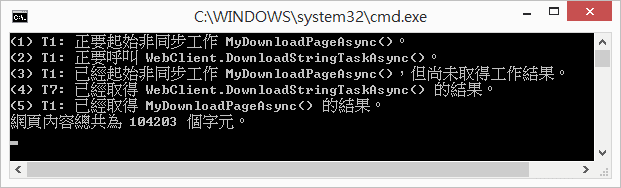 這裡也是先取得非同步方法 MyDownloadPageAsync 所傳回的 Task 物件。但這一次是用 Task 的 Result 屬性來取得非同步工作的執行結果,而不是寫成 await task。其實這裡不能使用 await 關鍵字,因為有用到 await 的函式都必須在宣告時加上 async 關鍵字,否則無法通過編譯。