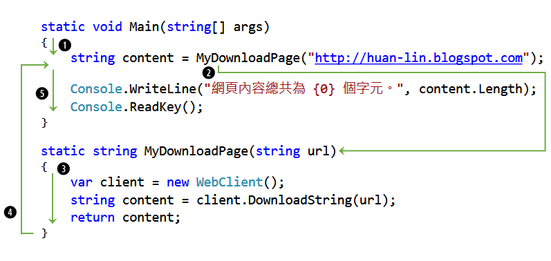 此 Console 應用程式範例有一個 MyDownloadPage 方法,它會透過 .NET 的 WebClient.DownloadString() 來取得指定 URL 的網頁內容,並傳回呼叫端。