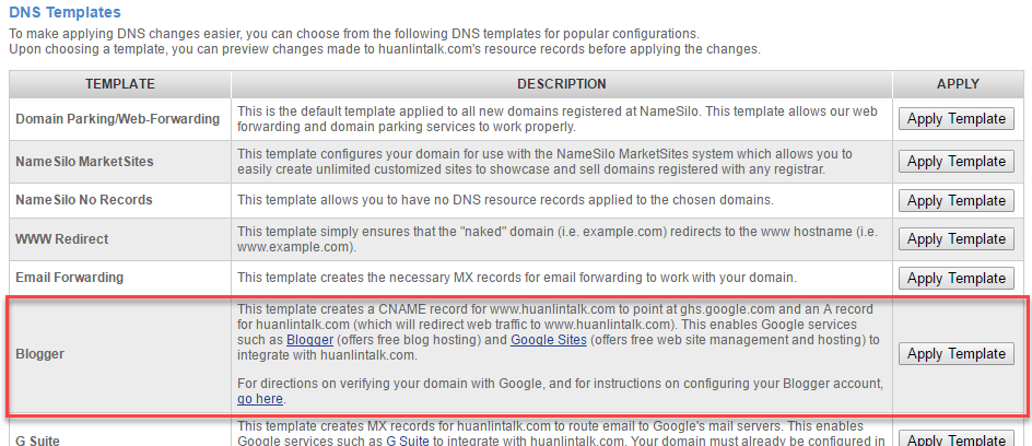 如果沒有這些記錄的話,也可以直接使用 namesilo 現成的樣板(templates)來快速完成這些設定。可用的樣板就顯示在 DNS 設定頁面的下方,找到 "WWW Redirect" 和 "Blogger"(因為我要把這個網域整合到 Google Blogger 平台),然後點 Apply Template 按鈕,再按指示操作即可。