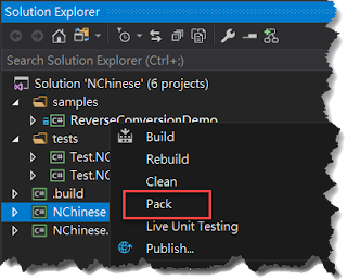 這個 .nuspec 檔案,可以透過命令列工具 nuget 來產生,或者也可以利用 Visual Studio 2017 的打包(Pack)功能來產生,作法是:在 Solution Explorer 中對專案名稱點右鍵、選 Pack。如下圖: