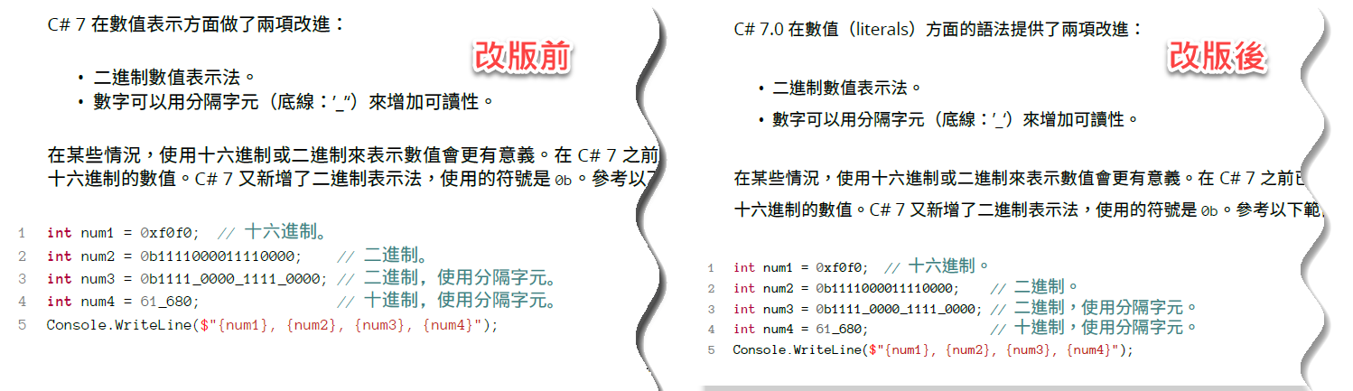 如上圖所示,從章節標題就可以分辨其內容所牽涉的 C# 版本。這是特別針對第六章(C# 7) 所做的一點小改進(因為 C# 7.0~7.3 實在太多新功能了)。